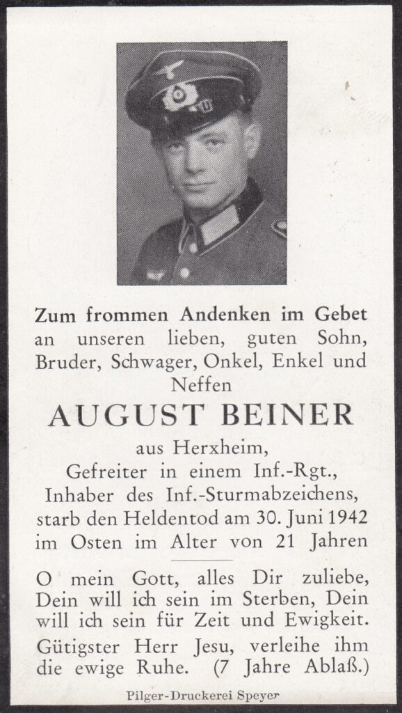 Die letzte Nachricht ist vom 27. Juni 1942 datiert. Als der Brief in der Heimat ankam, war August Beiner schon tot: „Gott sei Dank habe ich noch nichts abbekommen und vorerst bin ich noch gesund.“