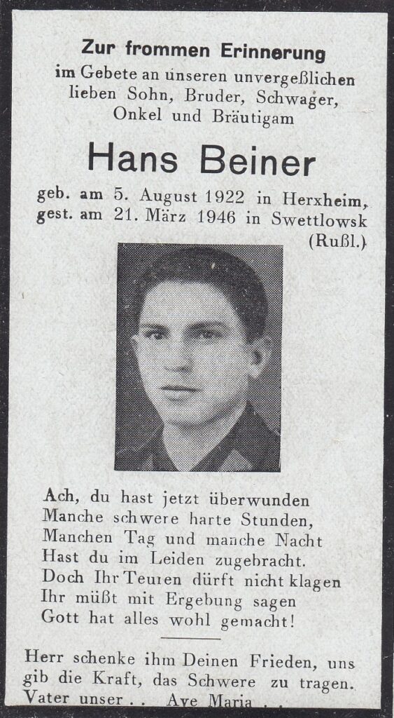 Mit Beginn des Zweiten Weltkrieges war Hans noch nicht wehrpflichtig. Aber am 3. Februar 1941 musste er als Funker einrücken. Er wurde einer Nachrichtenkompanie der Luftwaffe zugeordnet. Aus sicherer Quelle wissen wir, dass er mit Beginn des Krieges gegen die Sowjetunion ab 22. Juni 1941 an der Ostfront im Einsatz war. Er wurde mit der Ostmedaille ausgezeichnet und zum Gefreiten befördert. Schon bald kommen keine Nachrichten mehr von Hans. Er geriet in sowjetische Gefangenschaft; wann und wo wissen wir nicht. Er war einer von ungefähr drei Millionen Gefangenen der in den Weiten der Sowjetunion verstreuten Lager. Hans Beiner wurde in einem Gefangenenlager in Sibirien, jenseits des Ural, inhaftiert.