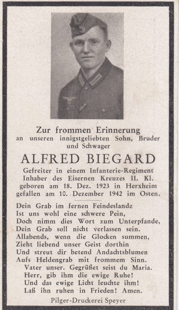 Zur 9. Armee scheint auch Alfred Biegards Einheit gehört zu haben. In diesen Tagen des Hin und Her verzeichnen die Deutschen zahlreiche Verluste. 60.000 deutsche Soldaten fanden in diesem Kämpfen den Tod. Alfred Biegard erhielt am 10. Dezember 1942 einen Bauchschuss und starb. Im Gedenkbuch der Kriegsgräberstätte Rshew in Russland ist sein Name verzeichnet. In Herxheim trauerten seine Eltern und ein uns bislang unbekannter Bruder um ihn.