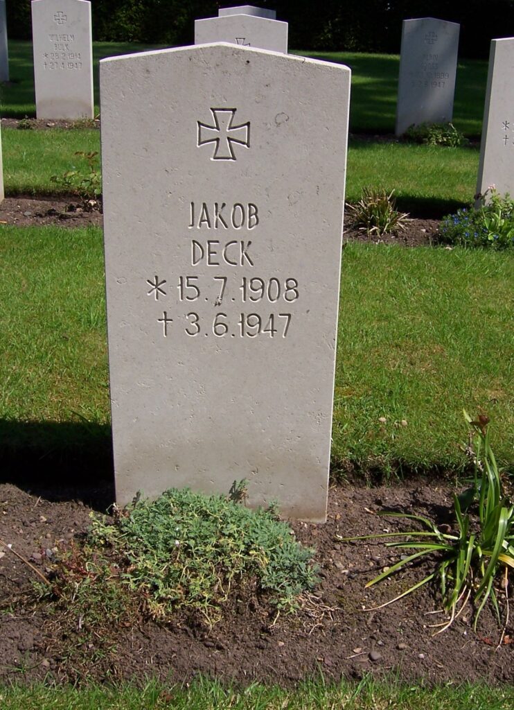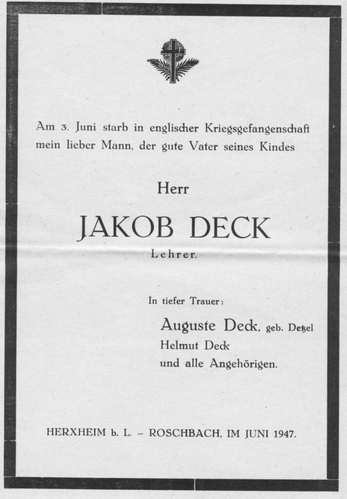 Es soll nicht unerwähnt bleiben, dass Jakobs Brüder Ludwig und Gustav ebenfalls Opfer des Weltkrieges wurden und in fremder Erde begraben liegen. Das Schicksal, das Jakob Deck erfuhr, ist auch das Schicksal anderer deutscher Kriegsgefangener geworden; so beispielsweise für den Herxheimer Georg Raßenfoß, der am 24. Dezember 1946 in französischer Kriegsgefangenschaft in Bar-Sur-Aube starb und sein Grab auf der Gräberstätte Fort-de-Malmaison fand.