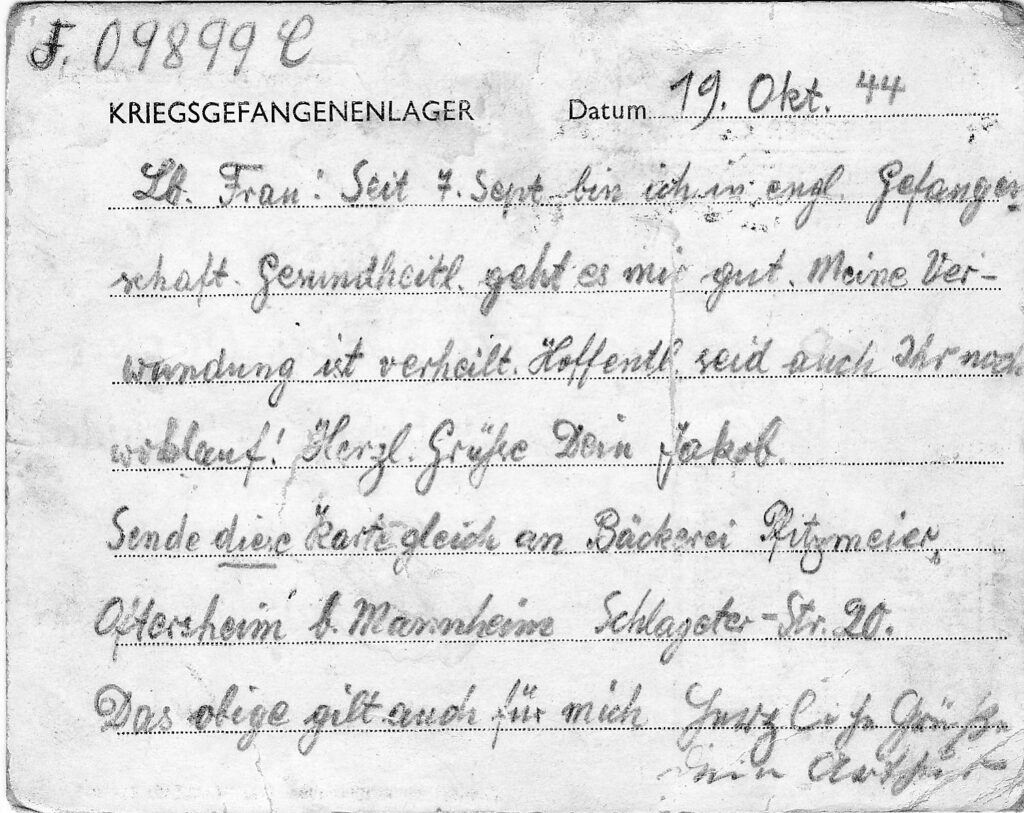 Mittlerweile war seine Frau mit Kind Helmut nach Herxheim ins elterliche Anwesen in der Oberen Hauptstraße 10 (damals Adolf-Hitler-Straße) umgezogen. Von den letztgenannten Geschehnissen wussten sie durch eine kurze briefliche Nachricht, in welchem er schrieb: „Bin seit 7. September in englischer Gefangenschaft. Gesundheitlich geht es mir gut. Meine Verwundung ist verheilt. Hoffentlich seid auch ihr noch wohlauf!“ Eine offizielle Nachricht über den Verbleib von Jakob Deck erfolgte erst am 11. Dezember 1945, mehr als ein halbes Jahr nach Kriegsende, durch eine Meldung des Roten Kreuzes. Im August 1946 war Jakob Decks Verwundung soweit geheilt, dass er auf der Blue Gate Farm bei Berkley nördlich von Bristol als landwirtschaftlicher Helfer zum Arbeitseinsatz kam. Er hatte ein gutes Auskommen mit der Besitzerfamlie Greenwood und war ein väterlicher Freund für deren Sohn Michael. Im Frühjahr 1947 machte sich bei ihm eine Lungentuberkulose bemerkbar. Er wurde ins Militärhospital in Stafford (nördlich von Birmingham) eingeliefert. Die fortgeschrittene Lungentuberkulose konnte nicht kuriert werden. Jakob Deck starb am 3. Juni 1947 und wurde drei Tage später auf dem dortigen Friedhof begraben. Erst im Februar 1948 erreichte Auguste Deck diese Nachricht und sie musste ihrem mittlerweile siebenjährigen Sohn verständlich machen, dass Papa nicht mehr heimkommen wird. Kurze Zeit später kam der private Besitz des Verstorbenen aus England zurück: Ehering, Briefe, Geldbeutel, Zigarettenetui.