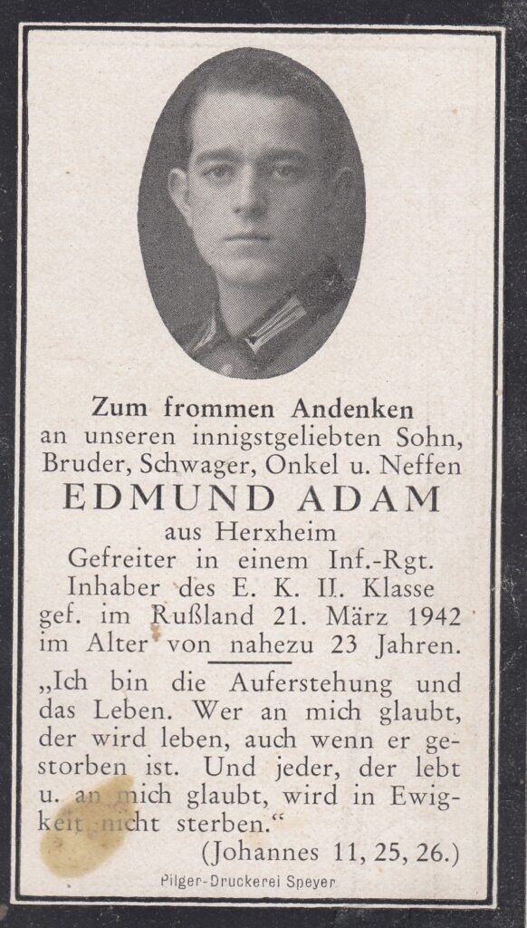 Am 26. August 1939 erreichte ihn der Einberufungsbefehl. Fünf Tage später folgte der Überfall Deutschlands auf Polen und der Beginn des 2. Weltkrieges. Edmund Adam ist bei einer Maschinengewehrkompanie. Sein erster Einsatz erfolgte im September 1940 als Besatzungssoldat in Belgien. In gleicher Aufgabe finden wir ihn ab Dezember 1941 in Nordfrankreich. Zum Begräbnis seiner am 10. August 1941 verstorbenen Mutter wird er sicherlich in Herxheim geweilt haben, um dann erneut an den Einsatzort zurückzukehren.