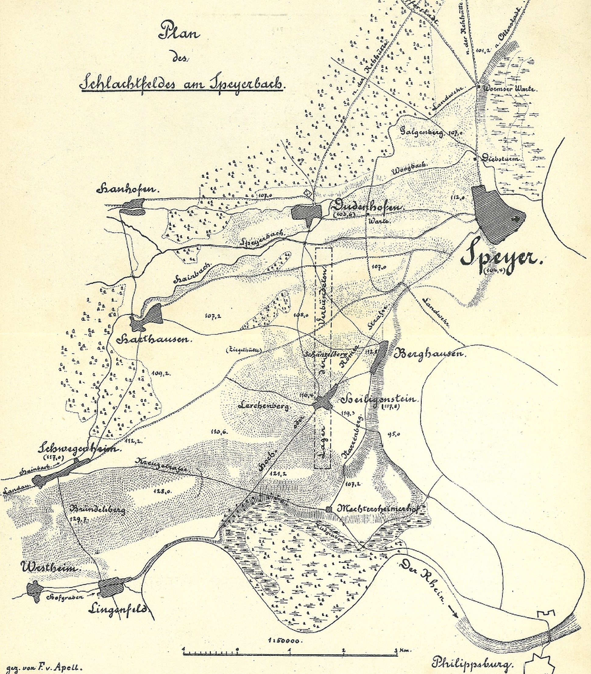 eigenen Infanterie, was in ein ungeordnetes Chaos mündete. In anderen Abschnitten der Schlacht hatten die Franzosen ihr Bajonett auf die Gewehre gepflanzt und setzten den flüchtenden Feinden nach. Die kurpfälzischen Kanonen waren an die Pferde Mechtersheimer Bauern gespannt worden, um sie weiter nach vorne ins Kampfgeschehen zu bringen. Doch war dies zu spät und vergeblich. Die Artillerieausrüstung und das Begleitpersonal fiel in die Hände der Feinde. Was sich im nördlichen Kampffeld noch retten konnte, zog sich bei einbrechender Dunkelheit über den Speyerbach und am nächsten Tag Richtung Frankenthal und Mannheim zurück.