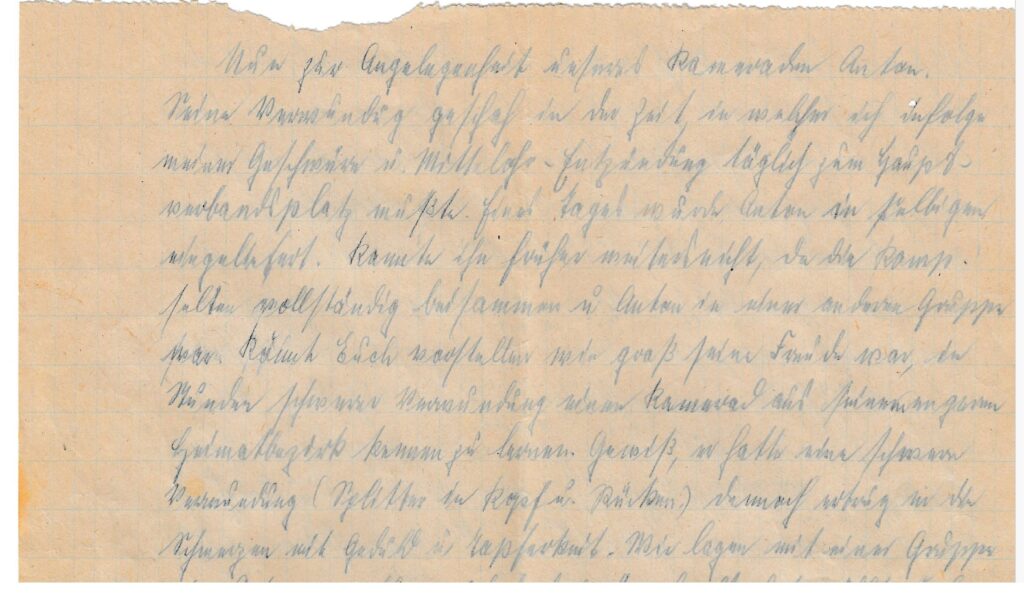 „Seine Verwundung geschah in der Zeit, in welcher ich infolge meines Geschwürs und Mittelohrentzündung täglich zum Hauptverbandsplatz musste. Eines Tages wurde Anton in selbigen eingeliefert. Kannte ihn früher weiters nicht, da die Kompanie selten vollständig beisammen und Anton in den anderen Gruppen war. Könnt euch vorstellen, wie seine Freude war, in Stunden schwerer Verwundung einen Kamerad aus seinem eigenen Heimatsbezirk kennen zu lernen. Gewiss, er hatte eine schwere Verwundung (Splitter im Kopf und Rücken), dennoch ertrug er die Schmerzen mit Geduld und Tapferkeit. Wir lagen mit einer Gruppe im Ort, zu welchem auch der Hauptverbandsplatz zählte. Folglich konnte ich Anton täglich besuchen. Immer größer war unsere Freude, wenn wir uns sahen und kurz von dies und jenem sprachen. Jegliche Wünsche wurden ihm gleich erfüllt. Unser Hauptfeldwebel schickte immer die besten Sachen wie Schokolade, Rotwein und dergleichen. So vergingen einige Tage, ohne dass sich eine Besserung oder Verschlechterung seines Zustandes erkennen ließ. Da, eines Abends bei meinem Besuch sagte er, es ginge ihm schlechter. Wir aber sagten, ach dieser Zustand geht wieder vorüber und machten ihm immer weiter Mut. Nur nicht auf falsche Gedanken kommen, es wird alles wieder gut werden! Doch den folgenden Vormittag brachte man mir die traurige Nachricht, dass Anton Josef in der vorangegangenen Nacht verstorben sei. Ich erkundigte mich gleich bei seinem Pfleger über die Todesstunde. Dieser sagte mir, es sei gegen 11 Uhr abends eingeschlafen und früh um 5 Uhr war er tot. Die Kameraden auf der Stube konnten es erst gar nicht glauben. Kurzum, er schlief ein und dies war sein letzter Schlaf. Ohne irgendwie mit dem Tode zu kämpfen, ging er in die Ewigkeit. Wir verloren in ihm einen guten Kameraden, der bei uns einen Namen besaß, wie nur einer ihn besitzen kann. Heute noch wird er in Gesprächen mit eingezogen. Weißt du noch: dort und dort. Anton, der gefallen bzw. gestorben ist, war auch dabei. Seine letzte Ruhe fand er auf einem schön neu angelegten Soldatenfriedhof am Waldrand zwischen Ustinovo und Bozy(?)“